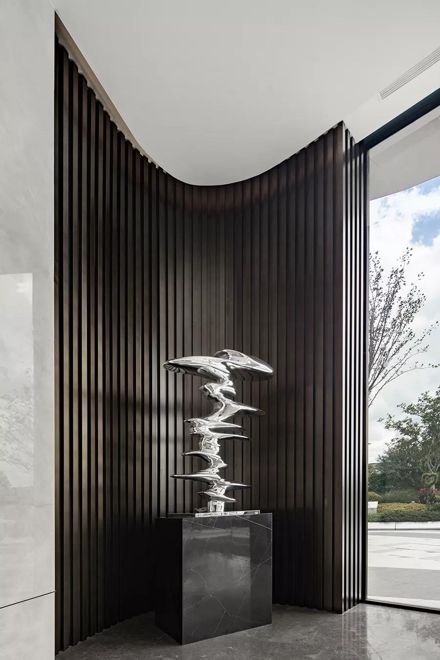 前臺一側(cè)仿銅不銹鋼錯落排列的格柵