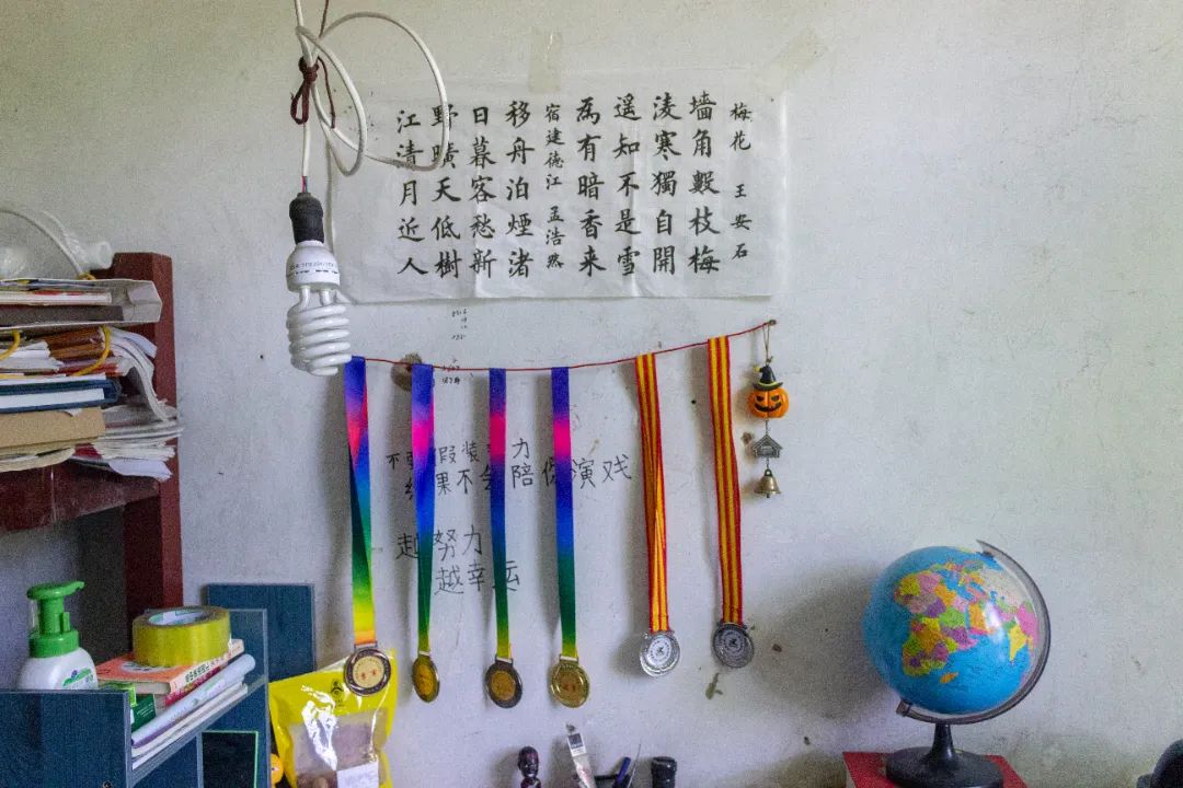 上中學(xué)后,學(xué)習(xí)壓力大,羅序浩的情緒也有波動。焦慮的時候,他就靠寫字和跑步來平復(fù)心緒。書桌前的白墻上貼著他寫的兩幅書法作品,羅序浩說:“以前練習(xí)寫楷書,現(xiàn)在喜歡行書,因為更瀟灑一些。”墻上還拉了一條繩子,掛滿了他跑步獲得的獎牌:“這是初三跑800米的亞軍、高一800米季軍、高一1500米冠軍,我還跑過兩場6.6公里的校園馬拉松……”