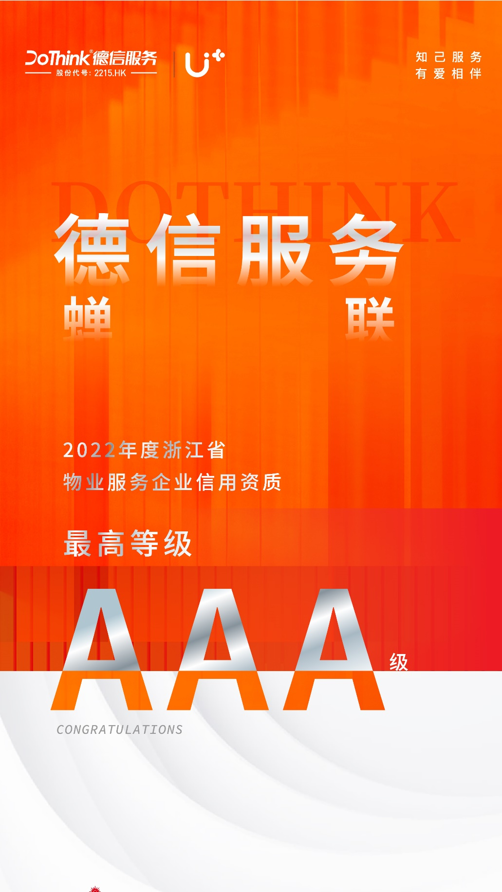 德信服務(wù)以良好的信用狀況、優(yōu)質(zhì)的服務(wù)水平蟬聯(lián)入選浙江省最高等級(jí)“AAA”級(jí)物業(yè)服務(wù)信用企業(yè)名單。