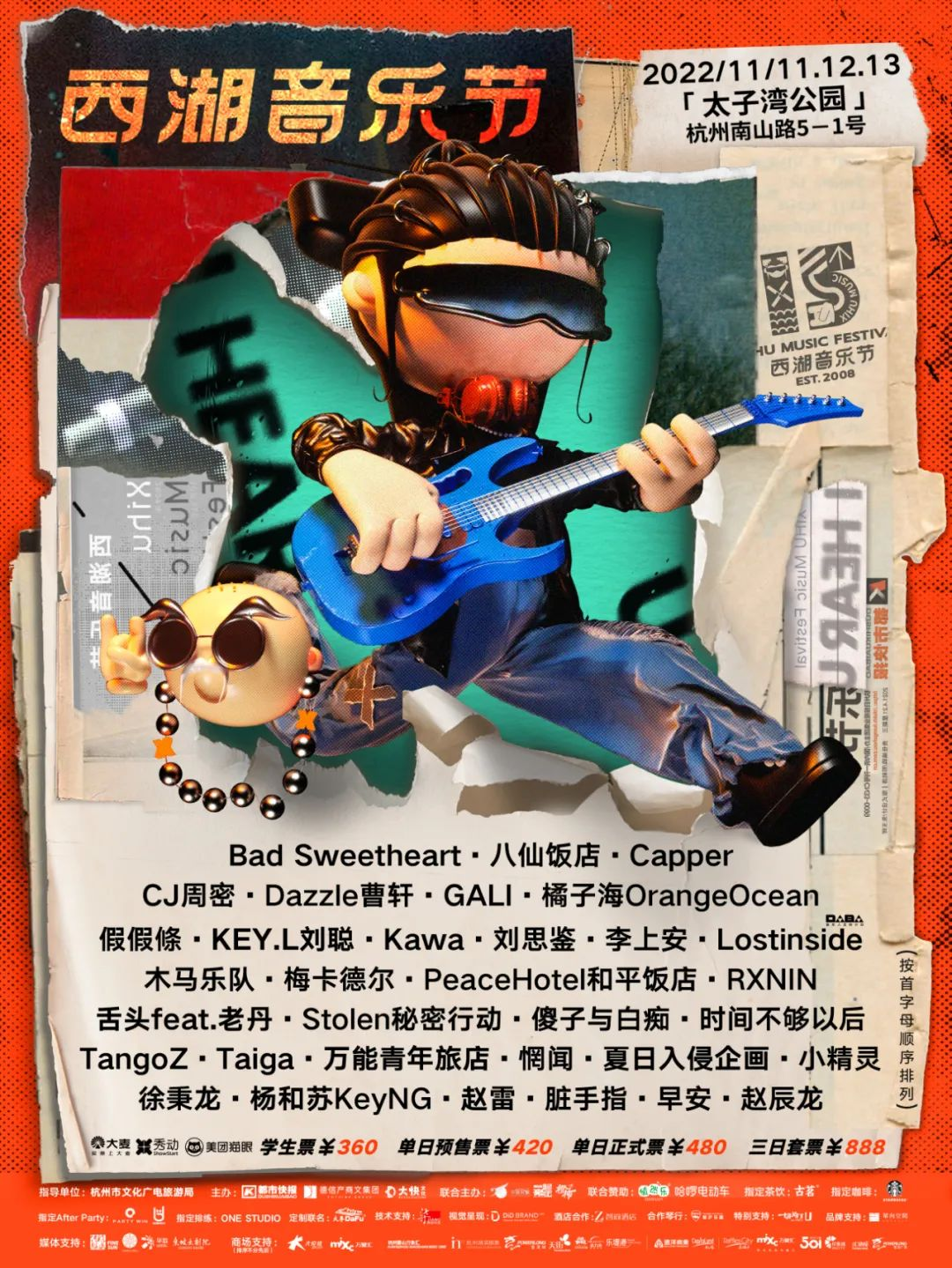 11月11日、12日、13日,萬能青年旅店、KEY.L 劉聰、趙雷、舌頭樂隊、楊和蘇KeyNG、木馬樂隊、惘聞、夏日入侵企畫、GALI、Stolen秘密行動、橘子海Orange Ocean等音樂人將在杭州西湖太子灣公園,與你一起開啟每一個精彩瞬間!