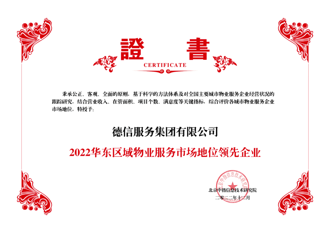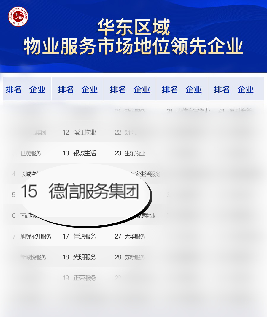 12月7日,“2022中國房地產(chǎn)大數(shù)據(jù)年會暨2023中國房地產(chǎn)市場趨勢報告會”隆重召開。本次報告由中國指數(shù)研究院發(fā)布,德信服務(wù)憑借專業(yè)化品質(zhì)服務(wù)以其在華東區(qū)域的卓越表現(xiàn),榮膺“2022華東區(qū)域物業(yè)服務(wù)市場地位領(lǐng)先企業(yè)”,位列第15位。