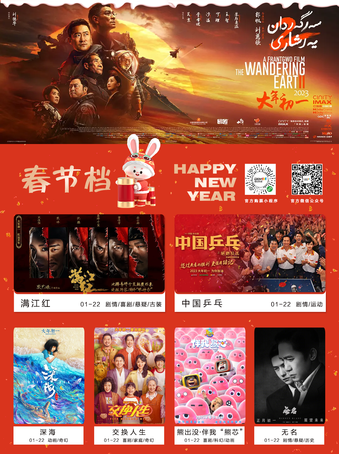 春節(jié)檔七部大片集結(jié)!大年初一霸氣開年!“流浪”啟程 綻放希望《流浪地球2》、迷局深藏 懸案待破《滿江紅》、永不放棄 涅槃重生《中國乒乓之絕地反擊》、諜戰(zhàn)對決 暗流涌動《無名》、奇“換”之旅 歡樂爆笑《交換人生》、生命色彩 鮮活瑰麗《深?!?、熊強(qiáng)組合 趣味十足《熊出沒·伴我“熊芯”》,多種類型的大片齊齊上線,快帶上家人朋友一起來德信影城看春節(jié)大片吧!