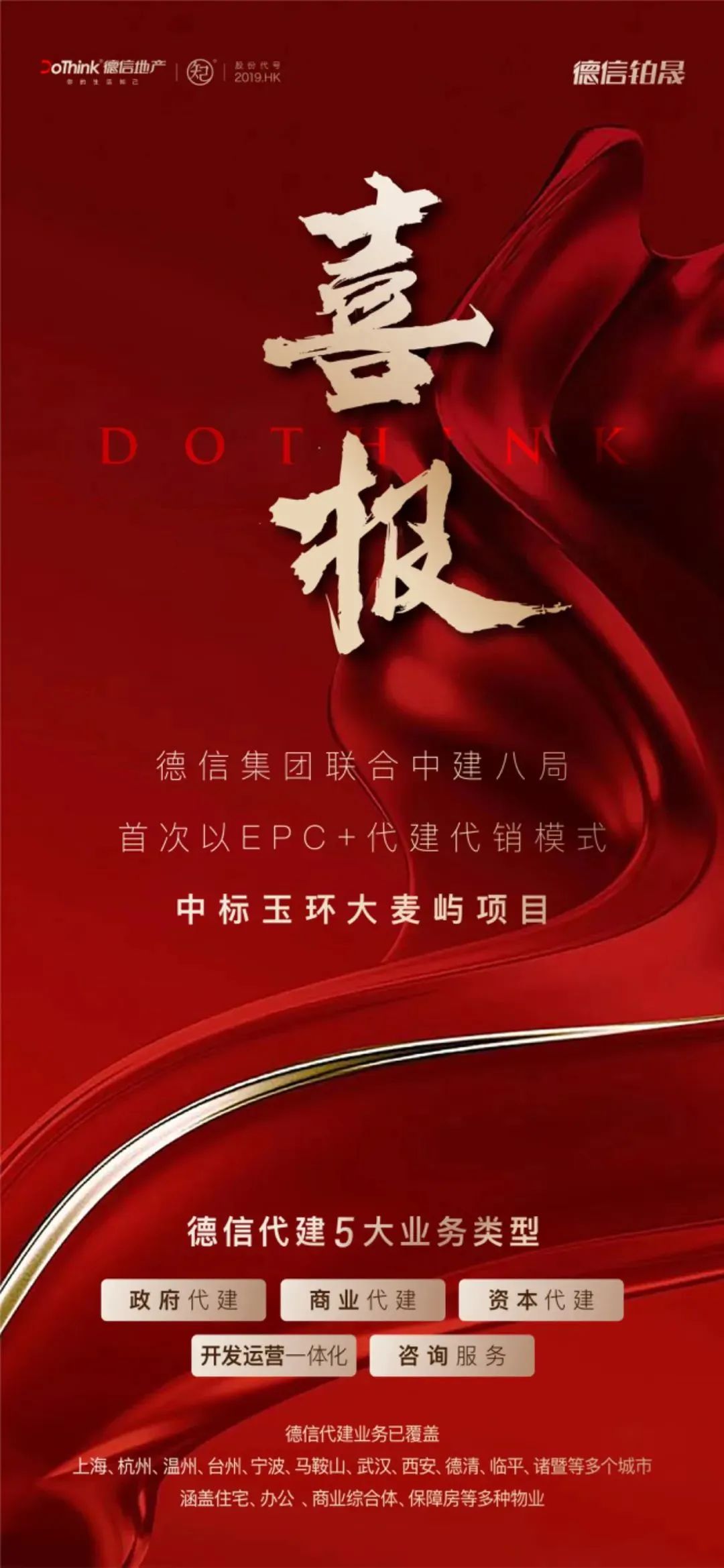 近日,德信集團聯(lián)合中建八局,首次以EPC+代建代銷模式中標玉環(huán)大麥嶼項目。德信代建主要包含政府代建、商業(yè)代建、資本代建、開發(fā)運營一體化、咨詢服務五大業(yè)務類型。目前已覆蓋上海、杭州、溫州、臺州、寧波、馬鞍山、武漢、西安、德清、臨平、諸暨等多個城市,涵蓋住宅、辦公、商業(yè)綜合體、保障房等多種物業(yè)。德信集團積極布局代建業(yè)務,也為企業(yè)探索新發(fā)展模式提供了一個方向。今后,德信集團將攜手合作伙伴,共建美好生活、打造理想家園。