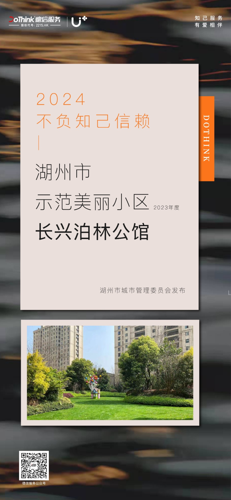 星光不負趕路人。近日,湖州市城市管理委員會發(fā)布《關于命名2023年度湖州市“美麗小區(qū)”“美麗街巷”的通報》,德信服務在管的湖州市泊林公館正式獲評湖州市示范美麗小區(qū)稱號,這也是繼去年時代公館等5個項目同時獲評后,我們再獲這一榮譽。
